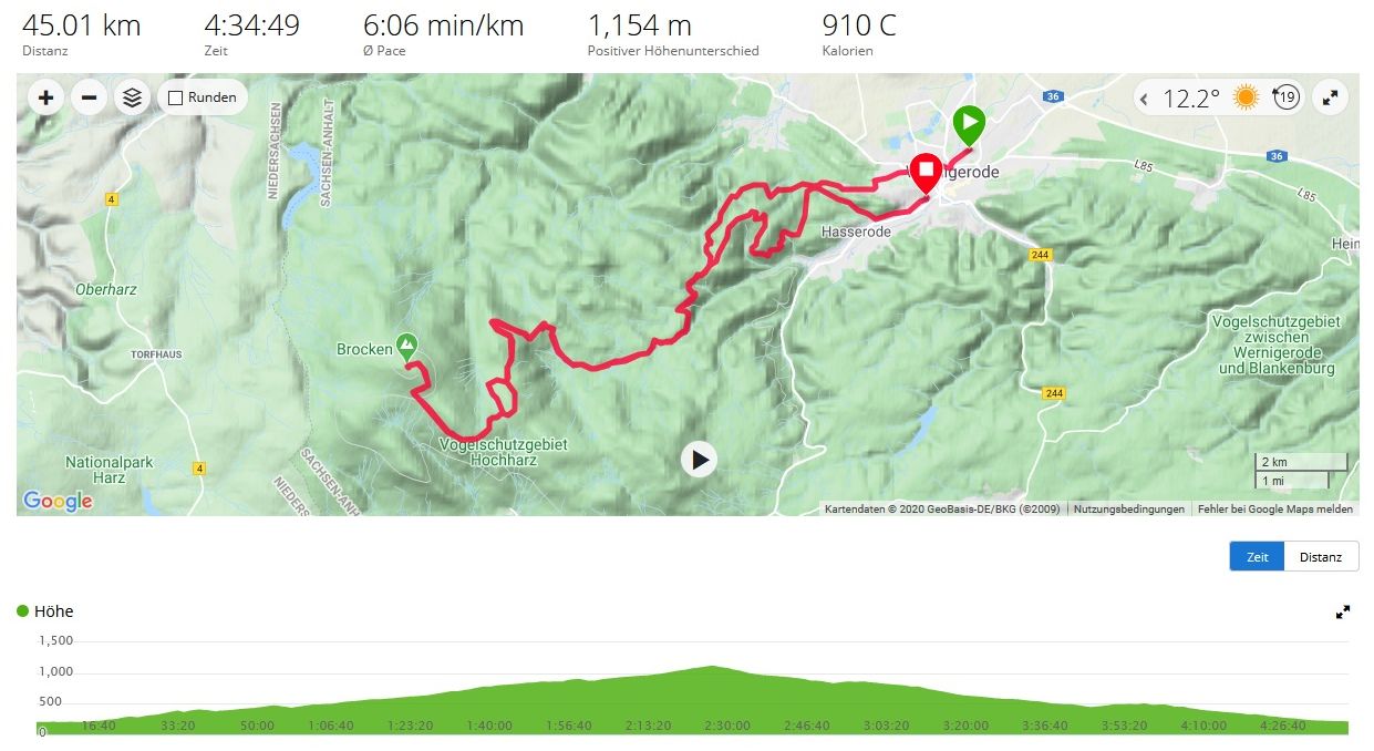 Aufgrund vorheriger Teilnahmen am Rennsteiglauf (Ultra, Marathon) in den Vorjahren, hat der Sportler entschlossen bei der Aktion “Rennsteigläufer at Home“ teilzunehmen. Dabei erhält man nach einer solidarischen Spende, eine Startnummer für die ausgewählte Distanz durch den Veranstalter. Unter Einhaltung aller aktuellen Vorgaben ist Timo dann am 16.05.2020 um 9 Uhr in Wernigerode gestartet um eine Wendepunktstrecke über den Brocken zu laufen. Begleitet und mit Getränken versorgt wurde er durch seine Ehefrau Nina auf dem Fahrrad. Nach 45km bei leicht bewölktem aber trockenem Wetter war das Ziel nach 4:34:49 erreicht. Laut Aufzeichnung wurde ein pos. Höhenunterschied von 1154m absolviert.