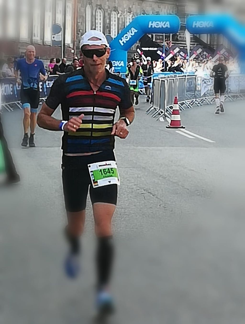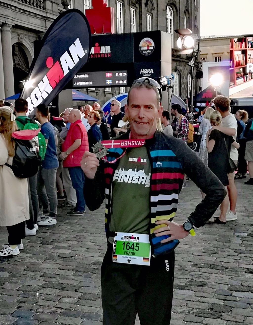 Nach 180 km und 5:34 Std Fahrzeit, erreichte ich die Wechselzone im Herzen von Kopenhagen an der Dänischen Nationalbank. Raus aus den Radschuhen und die Laufschuhe geschnürt. Los ging es auf vier lange Runden. Trotz vorheriger, verletzungsbedingter vierwöchiger Laufauszeit fühlten sich die Sehen und Muskeln wider erwarten gut an und ich fasste Mut. Die Strecke, gesäumt von tollen Zuschauern an einigen Hotspots an der Strecke feuerten uns fantastisch an. Das ganze motivierte auch zum Durchhalten, denn die Oberschenkel brannten nach gut 30 km schon ordentlich und wollten eigentlich ihren Dienst einstellen, so dass auch einige Gehpausen eingelegt wurden. Aber schlussendlich am Christiansborg Schlossplatz, nach 4:35 Std für die 42 km, war endlich der rote Teppich erreicht und der Zielbogen in Sicht. Jeder Athlet wurde vom Ansager persönlich begrüßt und mit den Worten „You are an IRONMAN“ abgeklatscht. Die Zuschauer feierten uns Athleten ebenso laut. Dann war es geschafft ! Nach 11:47 Std. baumelte die ersehnte Finishermedaille am Hals.