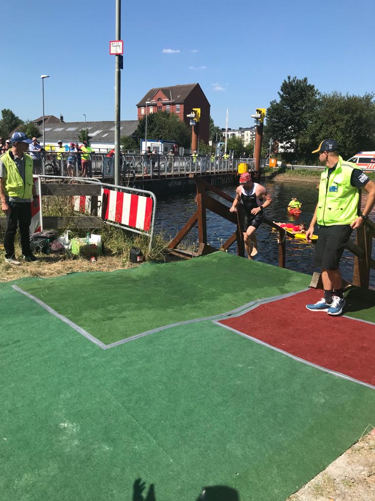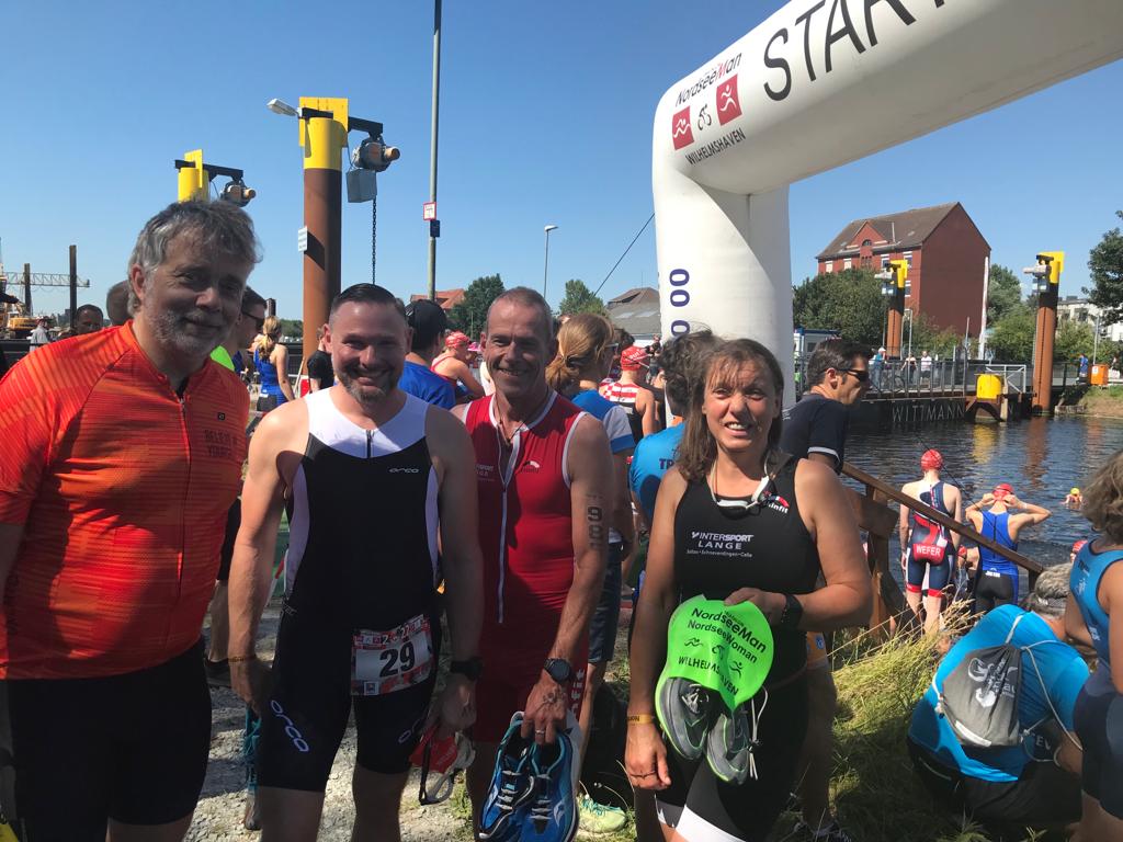 Dafür führten die Teams eine Mini-Staffel durch: Vier Teammitglieder jeder Mannschaft schwammen je 250 Meter und legten eine Laufstrecke von einem Kilometer zusätzlich zurück, um möglichst früh nach dem allgemeinen Startschuss starten zu dürfen. Das Team des Heidekreises startete an achter Stelle. Zunächst schwammen die Athleten und Athletinnen eine Distanz von 500 Metern im kühlenden Hafenwasser. Nach dem Wechsel auf das Fahrrad ging es auf 20km in den Norden der Stadt, vorbei am Marinestützpunkt. Die sich anschließende fünf Kilometer lange Laufstrecke führte direkt am Jadebusen entlang. Vom Heidekreisteam erreichte als erster Frank Rohleder das Ziel mit einer Gesamtzeit von 1:27 Stunden, gefolgt von Jens Butschbach (1:38 Stunden), Dirk Sauer (1:40 Stunden) und Andrea Stolz (1:44 Stunden). In die Gesamtzeit fließen die Ergebnisse des „Swim&Runs“ mit ein.