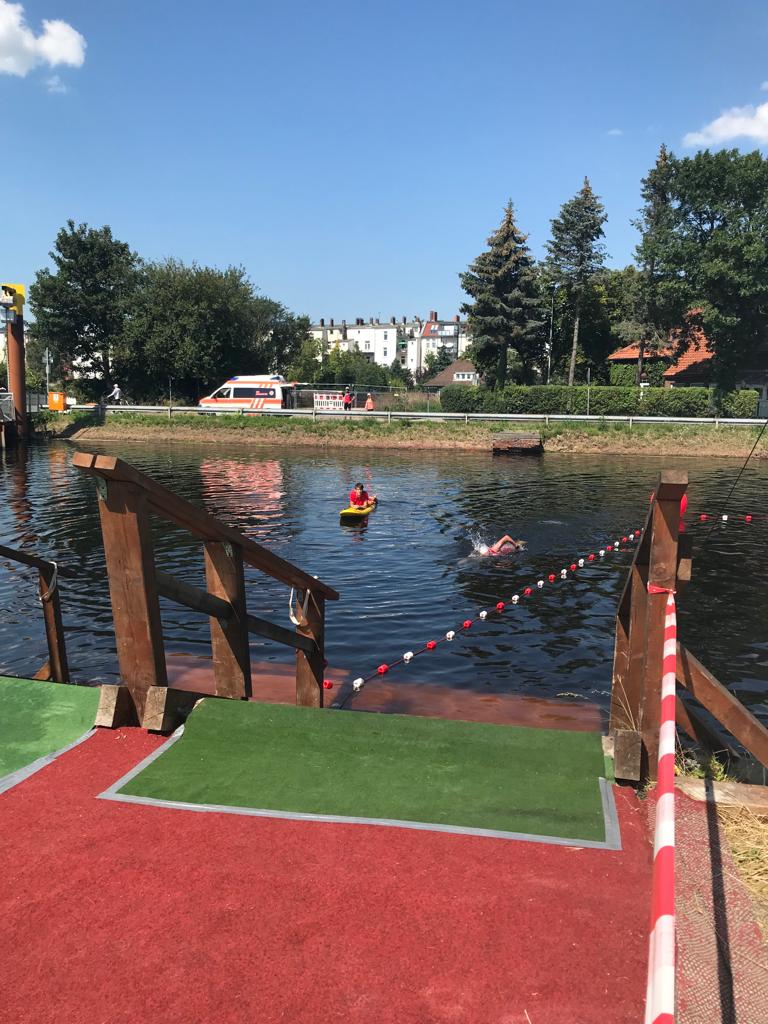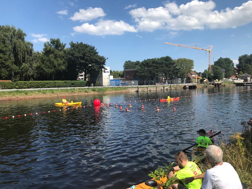 Bei einer Tageshöchsttemperatur von 32 Grad führte der Turn- und Sportverein Rüstringen Olympia Wilhelmshaven nach zweijähriger Pause am Samstag den 13.08. der NordseeMan/Woman Triathlon durch. Die Mixed Mannschaft der Triathlongemeinschaft Heidekreis trat mit vier Teilnehmenden an. Anders als bei einem „normalen“ Triathlon, erwartete die Teilnehmenden vor der eigentlichen Veranstaltung eine besondere Herausforderung: Ein „Swim&Run“, um den jeweiligen Startplatz der Mannschaften zu ermitteln.