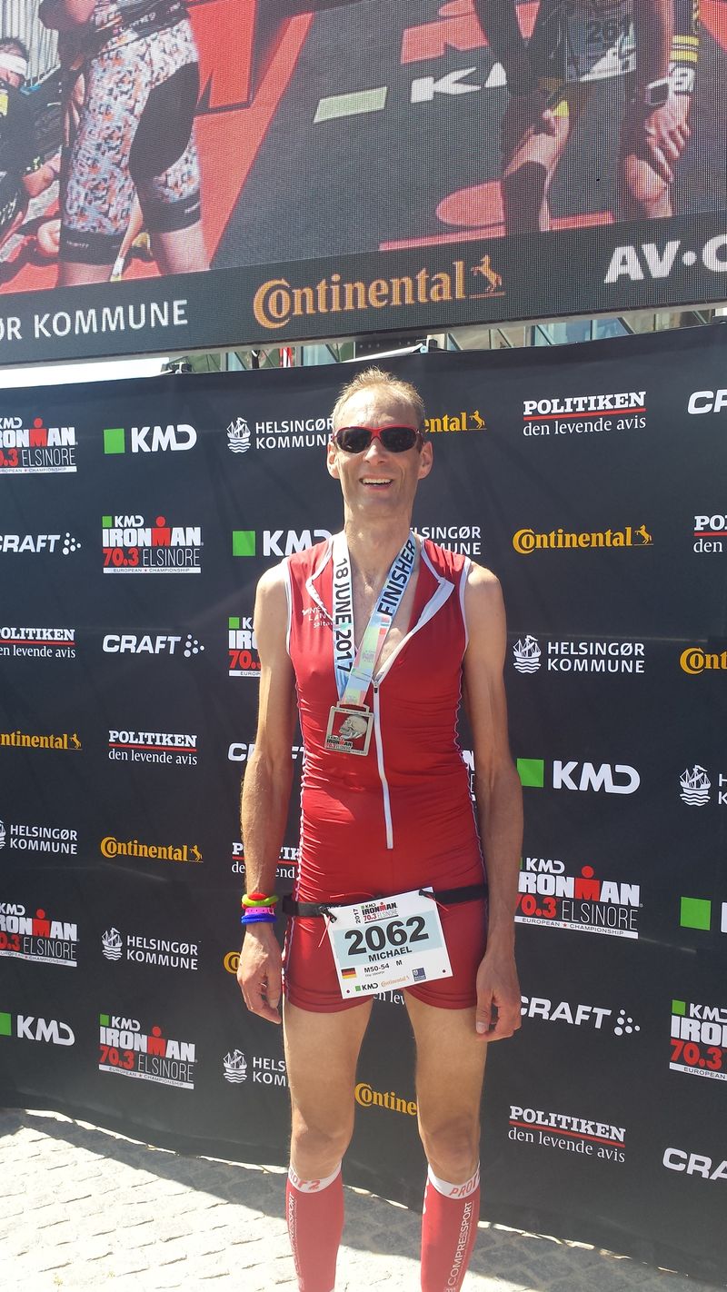Die Auftaktdisziplin führte die Triathleten über eine wahre Zick-Zack-Strecke durch das kleine Hafenbecken Helsingor´s. Aufgrund der vielen Richtungsänderungen war es gerade für Brillenträger nicht immer ganz einfach den Überblick zu behalten. Nach etwas enttäuschenden 39:08 min stieg Ringe aus dem Wasser. Anschließend ging es auf die 90 km 1 Loop Radstrecke. Die Route führte die Teilnehmer durch den Norden der Insel Seeland. Ringe benötigte lediglich 2:31:40 min und konnte etliche Plätze gut machen. Bei strahlend blauem Himmel, mittlerweile herrschten knapp 30 Grad, mussten die Profis und Hobby-Triathleten die Halbmarathondistanz auf einer 3.5 Loop Strecke bewältigen. Diese führte die Athleten durch den Hafen , um das Schloß Kronborg, bekannt durch das Schauspiel Hamlet von William Shakespeare, durch die Altstadt zurück in den Hafen. Michael Ringe konnte den abschließenden Halbmarathon in 1:49:40 beenden und belegte in einer Gesamtzeit von 5:09:30 den 44. Platz in seiner Altersklasse. Auf der Laufstrecke wurden die Athleten insbesondere auf dem Abschnitt vom Hafen zur Innenstadt von zahlreichen Zuschauern angefeuert.