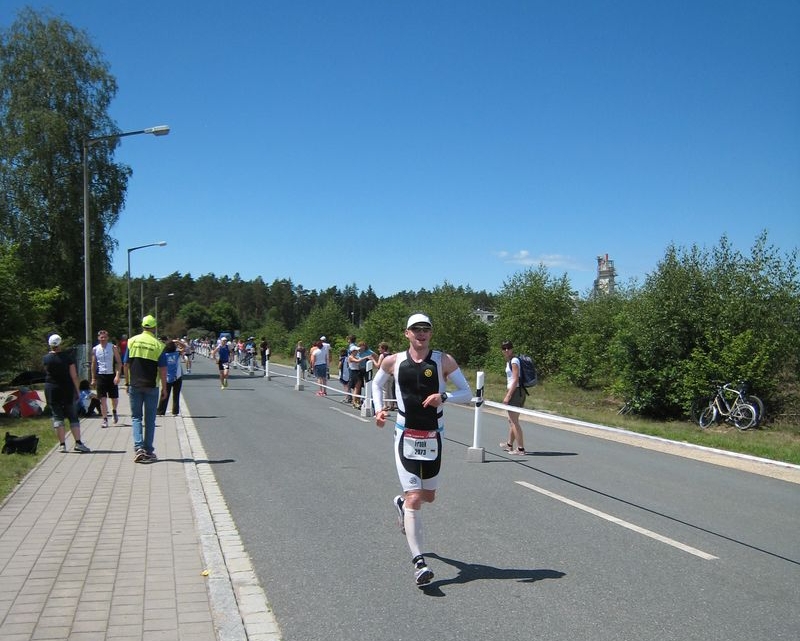 Für Motivation sorgten die Zuschauer, in jeder noch so kleinen Ortschaft wurden die Fahrer frenetisch angefeuert, Volksfeststimmung war überall. Stimmungsnest und Höhepunkt war der Solarer Berg in Hilpoltstein, der ein unvergessliches Erlebnis bot. Auf der steilen und 800 Meter langen Auffahrt bildeten zigtausend Zuschauer eine schmale Gasse und erzeugen ohrenbetäubenden Lärm. Nach vielen Eindrücken und 5:19 Std. erreichte Frank Haller die zweite Wechselzone. Mit einer Durchschnittsgeschwindigkeit von 34 Km/h lag er in seinem Zeitplan. Frank Rohleder folgte in 5:37 Std. Dirk Sauer in 6:45 Std. Staffelfahrerin Heidi Eggers benötigte 6:12 Std. und übergab den Chip an Helmut Eggers für den abschließenden Marathon. Zunächst verlief die Laufstrecke von Roth an den Kanal dann nördlich zum ersten Wendepunkt, zurück und dann südlich zum zweiten Wendepunkt. Hier war mentale Stärke erforderlich. Die nicht sehr abwechslungsreiche Laufstrecke folgt auf Schotterpisten schnurgerade dem Kanal. Die bisherige Wettkampfdauer und das sonnige Wetter mit 25 Grad Celsius ließen die Beine und die Sinne schwer werden. Durchhalten war angesagt, die zahlreichen Zuschauer sorgten für Unterstützung. Mit einer Marathonzeit von 3:37 Std. erreichte Frank Haller den Zieleinlauf. In einer Gesamtzeit von 9:57 Std. (Platz 247 ges.) hatte er die magische 10-Stundengrenze unterboten. Kurz danach lief Frank Rohleder nach insgesamt 10:54 Std. in Roth ein (Platz 863 ges.). Für den Abschlussmarathon benötigte er 3:48 Std. Dirk Sauer, der bisher in jedem Jahr in Roth startete, absolvierte ein konstantes Rennen und konnte den Zielkanal nach 14:10 Std. vor Einbruch der Dunkelheit erreichen. Auf den letzten Marathonmetern (5:52 Std.) begleitete ihn seine Familie. Staffelläufer Helmut Eggers lief die 42,195 Km in 3:50 Std. so dass die „Heidegeister“ nach einer Gesamtzeit von 11:27 Std. das Ziel erreichten. Auch im Zielbereich wurde jeder Triathlet vom Stadionsprecher begrüßt und vor tausenden von Zuschauern ins Ziel begleitet.