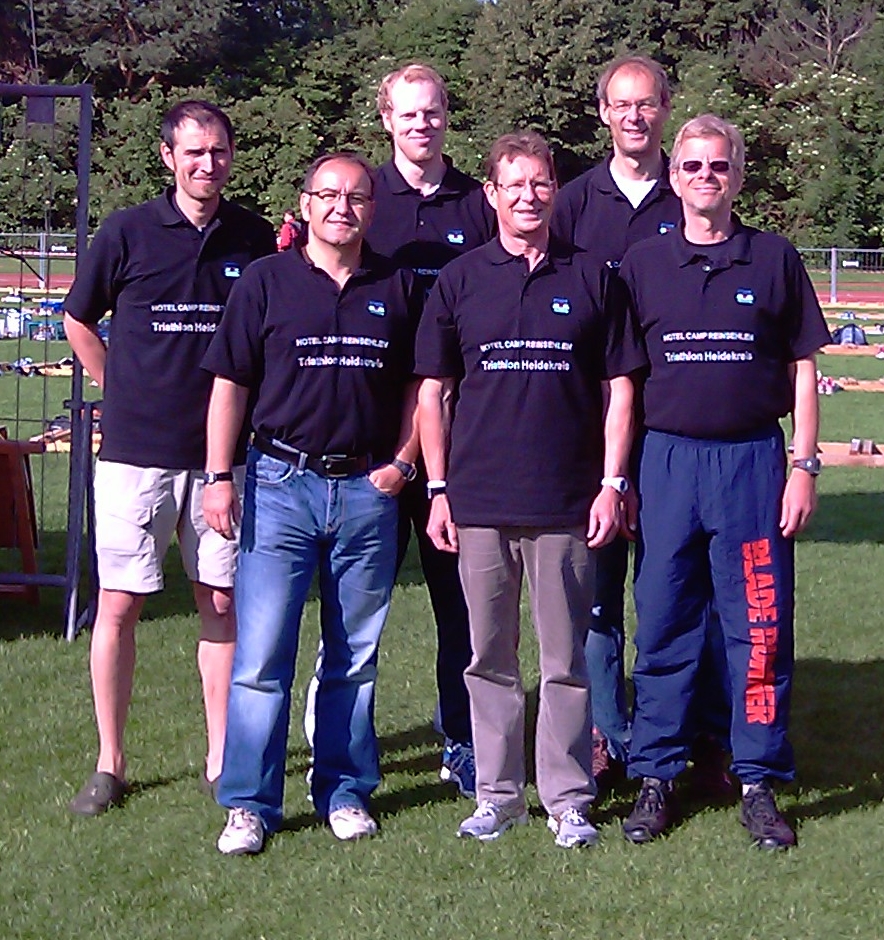 Zunächst war ein Rundkurs von 1,5 Km im Eixer See zu schwimmen. Mit einer Temperatur von 19° C war der See schon verhältnismäßig warm. Die geprüfte Wasserqualität war mit „sehr gut“ bewertet und somit war die erste Disziplin ein angenehmer Auftakt. Als guter Schwimmer bekannt, konnte Andre Meyer schon nach knapp 24 Minuten das Wasser verlassen. Mit nur gringem Abstand von etwas mehr als 2 Minuten folgte Michael Ringe, gefolgt von Andreas Bernstein. Die sich anschließende 40 Km-Radstrecke, größtenteils für den öffentlichen Straßenverkehr gesperrt, gestaltete sich flach und windanfällig. Im vereinsinternen Duell konnten Meyer und Ringe jeweils nach einem Radsplit von 1:10 Std. auf die Laufstrecke wechseln. Aufgrund der mittlerweile stark gestiegenen Temperaturen wurden die 10 Laufkilometer sehr schweißtreibend. Die Wendepunktstrecke war auf vier Runden aufgeteilt und führte jedes Mal auch durch das Stadion. Hier war das Stimmungsnest und die zahlreichen Zuschauer heizten die Sportler zusätzlich an. An den jeweiligen Wendepunkten begegneten sich die Athleten ständig und konnten so ihre Abstände kontrollieren. Andre Meyer zeigte keine Schwäche und konnte seinen Vorsprung mit einer Laufzeit von unter 45 Minuten ausbauen. Nach 2:18 Std. erreichte er das Ziel. Spannend wurde es doch noch hinter ihm. Michael Ringe erreichte nach 2:25 Std. das Ziel mit knappem Vorsprung vor Andreas Bernstein, der insgesamt 2:26 Std. benötigte. Rüdiger Lippert erreichte nach einem konstanten Rennen eine Zeit von 2:38 Std. Thomas Begemann (2:56 Std.) und Jürgen Krause (3:08 Std.) konnten ebenfalls zufrieden auf einen sehr gut organisierten Wettkampf zurückblicken. Derzeit liegen die Heidekreis-Triathleten auf Rang 30 der Landesliga Niedersachsen, vorausblickend auf den Abschlusswettbewerb in Northeim.